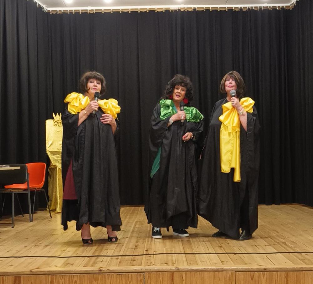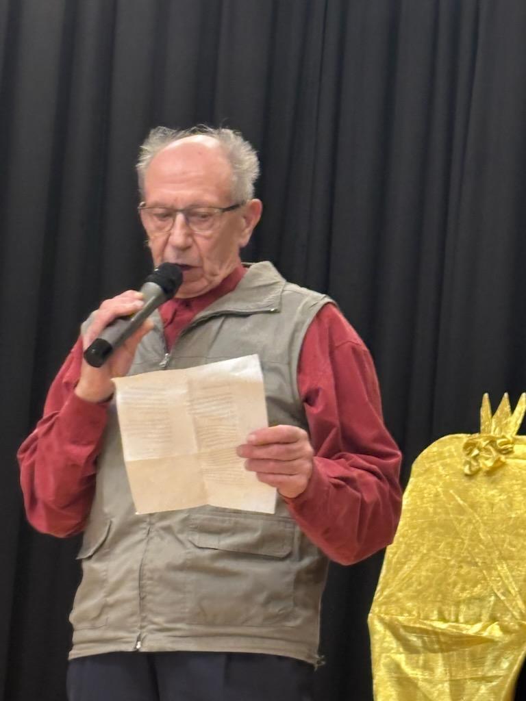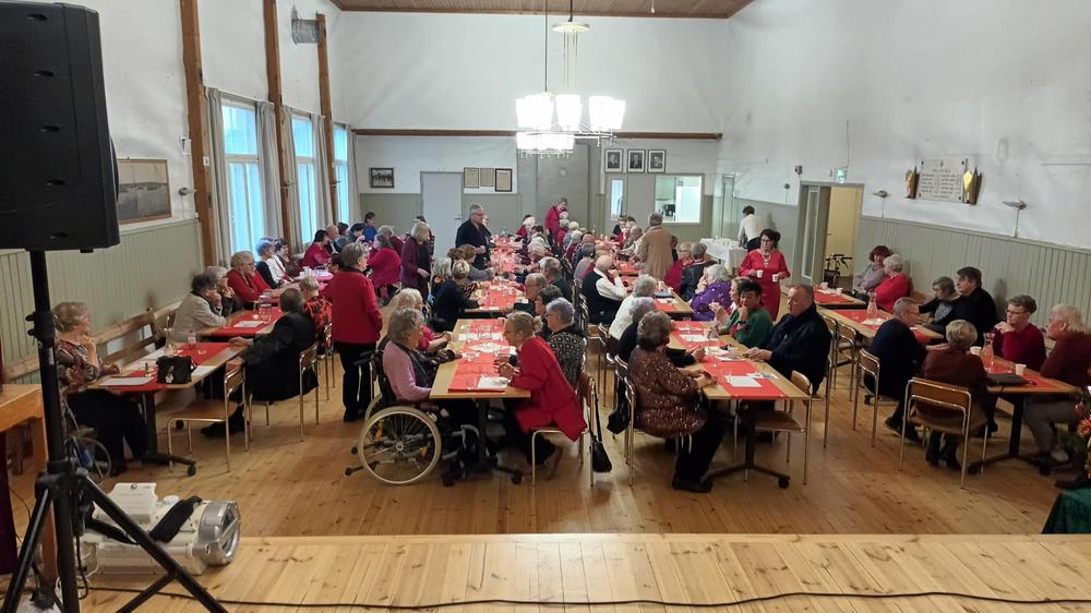 Yhdistyksen lauluryhmä lauloi ryhmittyneenä kultaisen kunniatuolin ympärille. Tuolilla istui kunniajäsen Eila Pirttimaa, 93, joka lausui myös runon. Juhlan kolmannesta runoesityksestä vastasi Toivo Aappola.