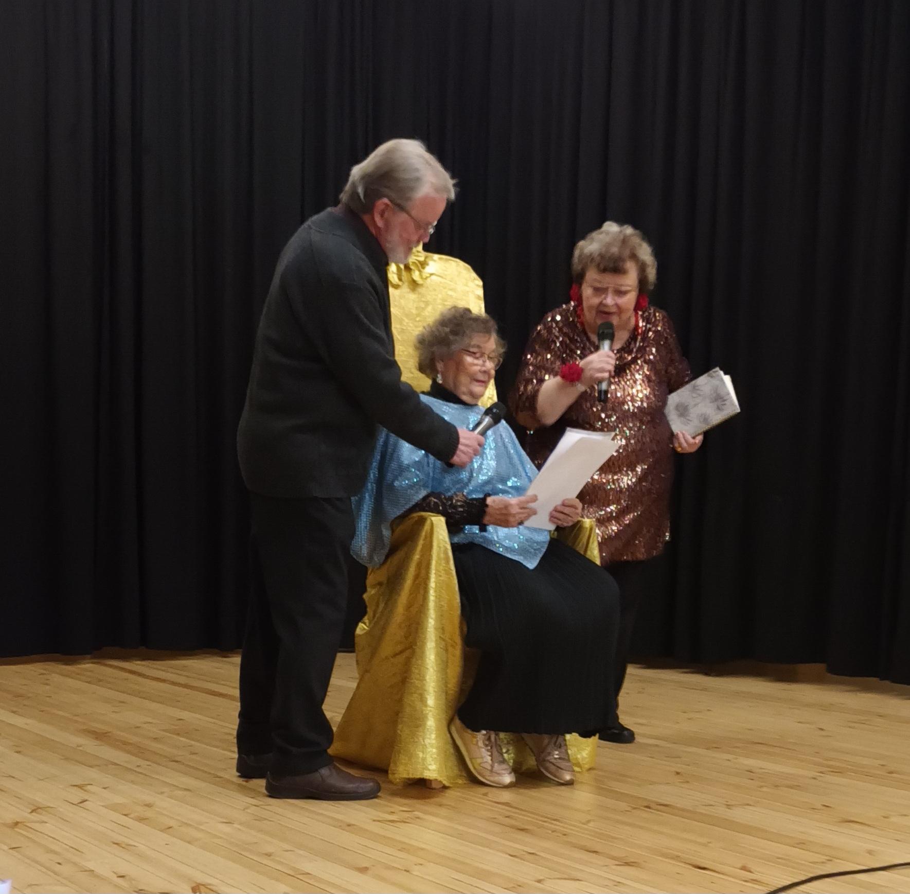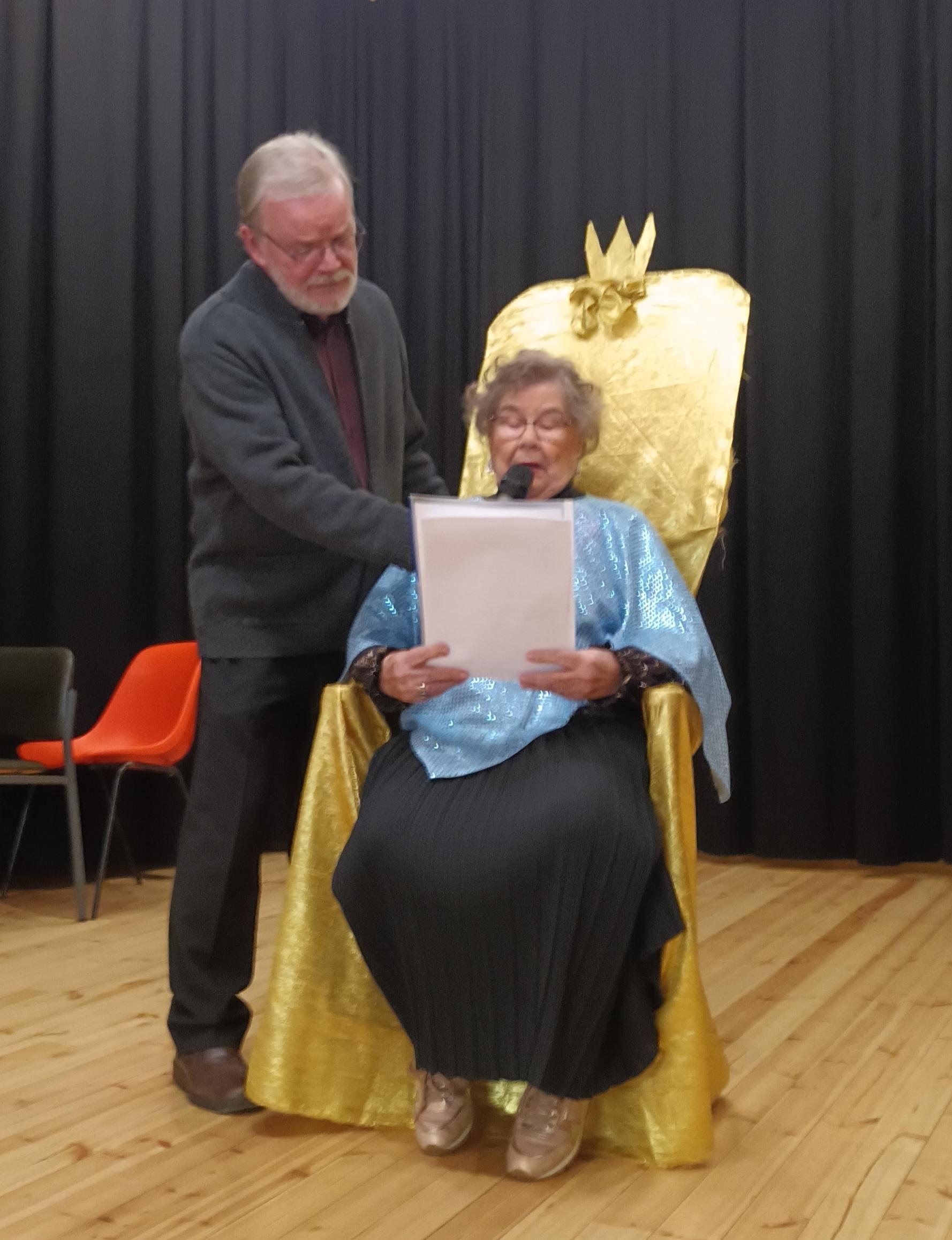 Yhdistyksen lauluryhmä lauloi ryhmittyneenä kultaisen kunniatuolin ympärille. Tuolilla istui kunniajäsen Eila Pirttimaa, 93, joka lausui myös runon. Juhlan kolmannesta runoesityksestä vastasi Toivo Aappola.